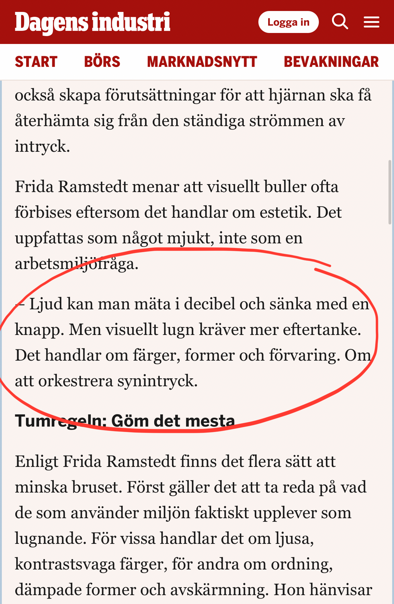 Idag publicerades en artikel med mig i affärstidningen Dagens Industri där jag uttalar mig om ett ämne jag tycker borde få lite mer uppmärksamhet: visuellt brus och hur det kan påverka förmågan att koncentrera sig på arbetsplatsen. Buller och höga ljud är ett problem som arbetsgivare brukar vara ganska snabba med att åtgärda, medan visuella intryck och störningsmoment för ögat inte tas på samma allvar. För många kan det ändå upplevas minst lika tröttande. Det är något jag har egen erfarenhet av efter att ha arbetat i reklambranschens öppna kontorslandskap men det finns säkert fler som kan känna igen sig. Hela artikeln hittar du här.
