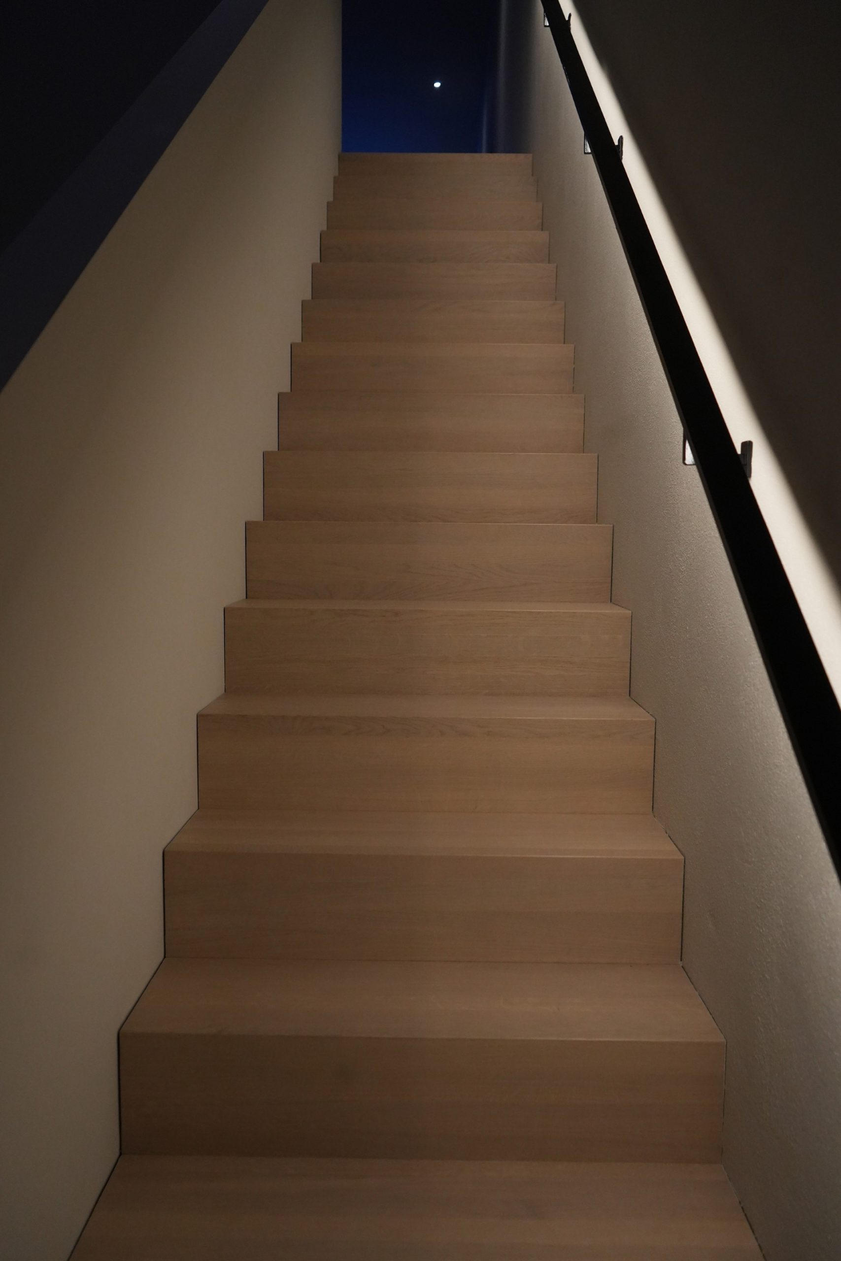 Efter mitt blogginlägg om lampor till trappor i nybyggda hus fick jag ett mail från en läsare, med foton på en lösning som kanske kan inspirera fler. De har låtit tillverka ett eget handräcke i 1,5 cm tunt och solitt stål (som för övrigt är hela 6 meter långt!) och lämnade då utrymme för en LED-slinga undertill. Strömkabeln har dolts i fästet mot den putsade väggen och är alltså omöjlig att se. Det krävdes lite planering att pricka strömmatningen, men resultatet är ett mjukt och dimbart stegljus som lyfter hela trapphuset. Tack för att ni delar era tips och bilder!