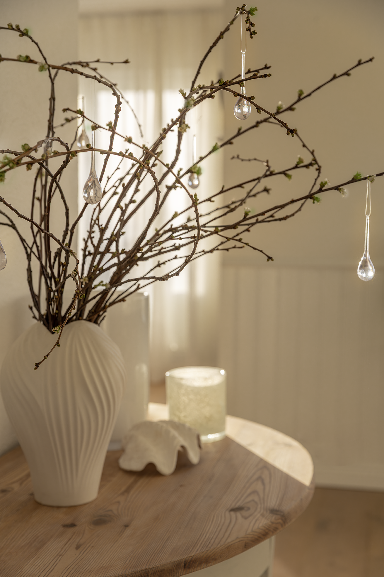 Jag längtar så intensivt efter påsken i år. Vi ska fira hemma hos oss och jag ser verkligen fram emot att duka upp för långlunch och ordna med äggjakt och skattkarta till barnen och deras kusiner. Jag skulle egentligen vilja börja påskpynta redan nu, men det känns lite väl tidigt så jag nöjer mig med några loppade glashängen i körsbärskvistar på sidobordet så länge. Eller på Årstidsbordet som jag först var på vippen att skriva, innan fingrarna tvärnitade på tangentbordet. Influencer-altaret såg jag att någon krönikör raljerande kallade det. Uff. Man känner sig som klyschornas-bingo-bricka ibland. Jag försöker förgäves kväva en impuls att försvara snäckan i bild. En sån har ju alla också just nu. Men den köpte jag faktiskt redan 2018, däremot vet jag att det är fel att inreda med snäckor, oavsett om den är äkta eller tillverkad i något slags snäckliknande plastmaterial. Förlåt. Borde jag kanske förtydliga att vi ska gå på påskmässan i Onsala kyrka, så att ingen tror att jag firar bara för att pynta och äta? Eller, ska jag bara radera alltihop och lägga upp en pressbild istället? Men då kanske inlägget blir för trist och opersonligt? Äsch. Det jag ville säga var att jag längtar efter påsken, att det känns för tidigt att pynta men att jag är väldigt glad över mina loppade droppar som kan hänga där så länge. Trots att jag nog inte är ett dugg unik.