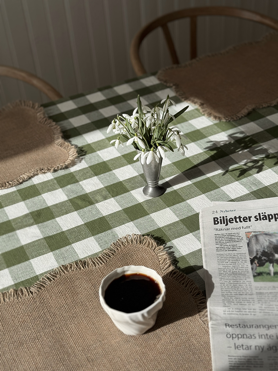 Duken till vår påsklunch hittade jag på H&M Home, servetterna har jag köpt från Table love för flera år sedan och ljusstakarna var en födelsedagspresent till mig själv. Liljan från Skultuna i mässing.