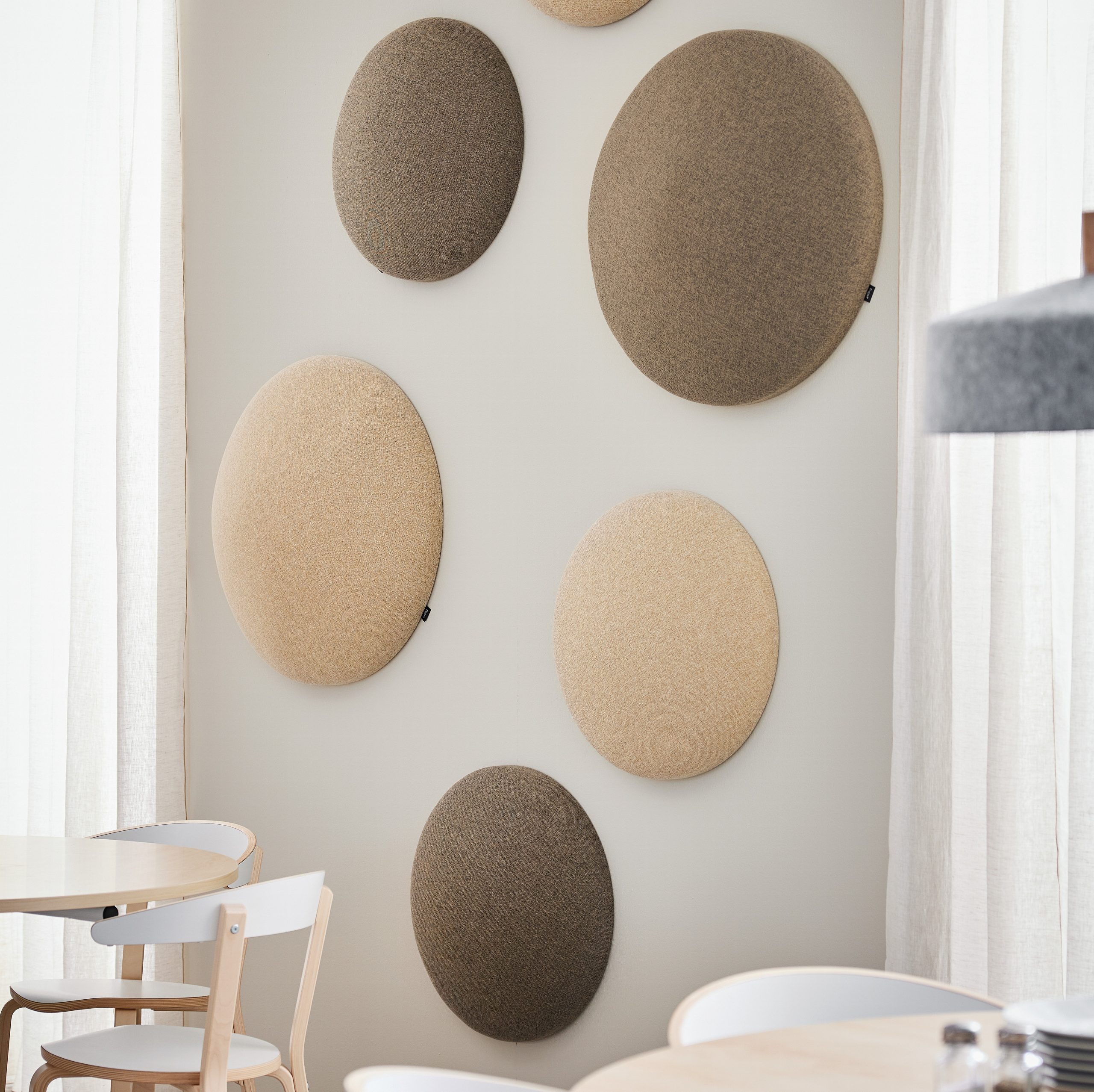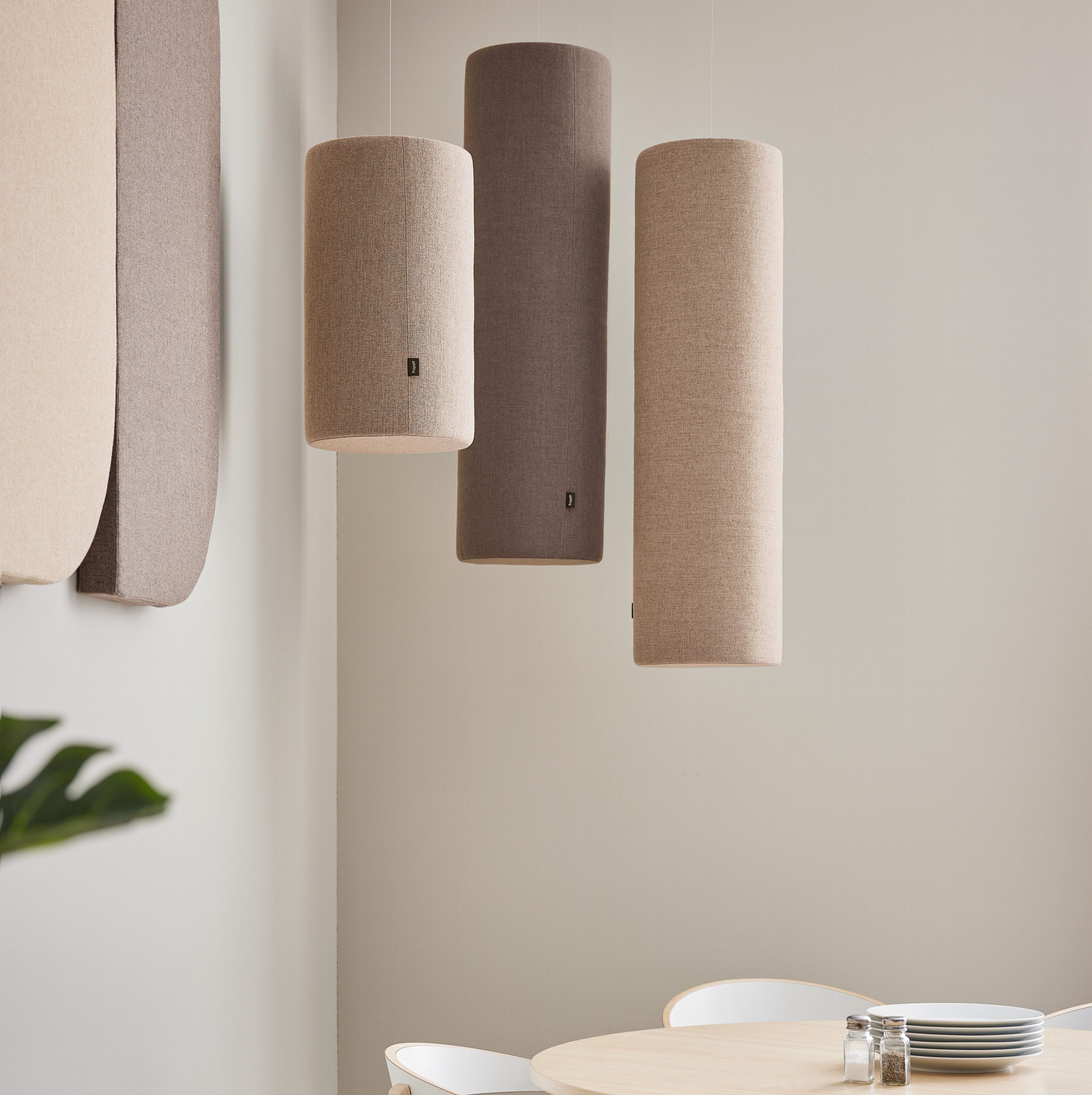 POLY ljudabsorbent finns både som takhängd modell och cirkelformad med välvd framsida för väggmontering, vilket effektivt dämpar ljud och buller.