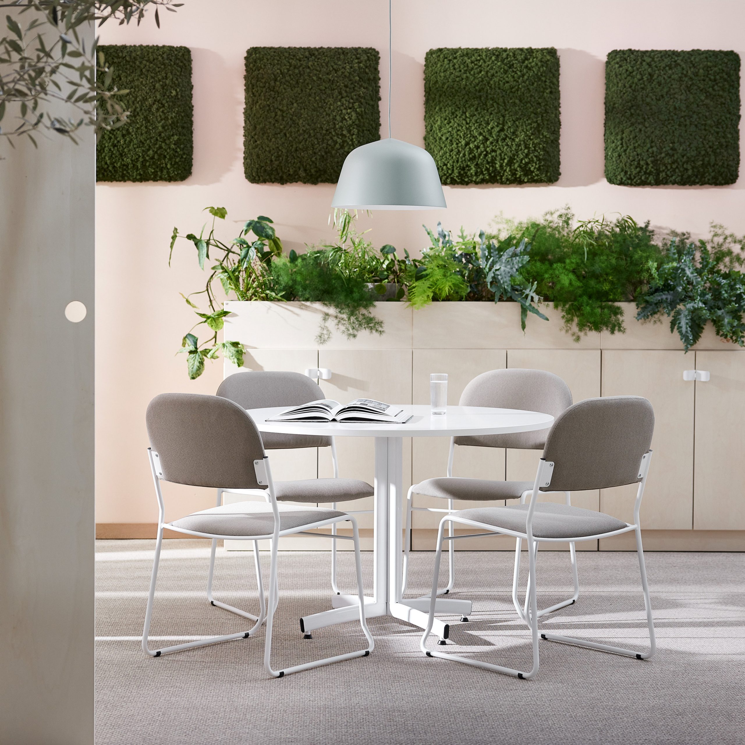 – Stoppade möbler dämpar också ljudets framfart men kanske känns som ett opraktiskt val i lunchrum med risk för spill och slitage men AJ Produkter har stolar med dynor som är slitstarka och håller sig fräscha länge. Tänk också på att en soffgrupp där man kan ta en kaffepaus kan ha stor effekt på ljudbilden i ett rum.