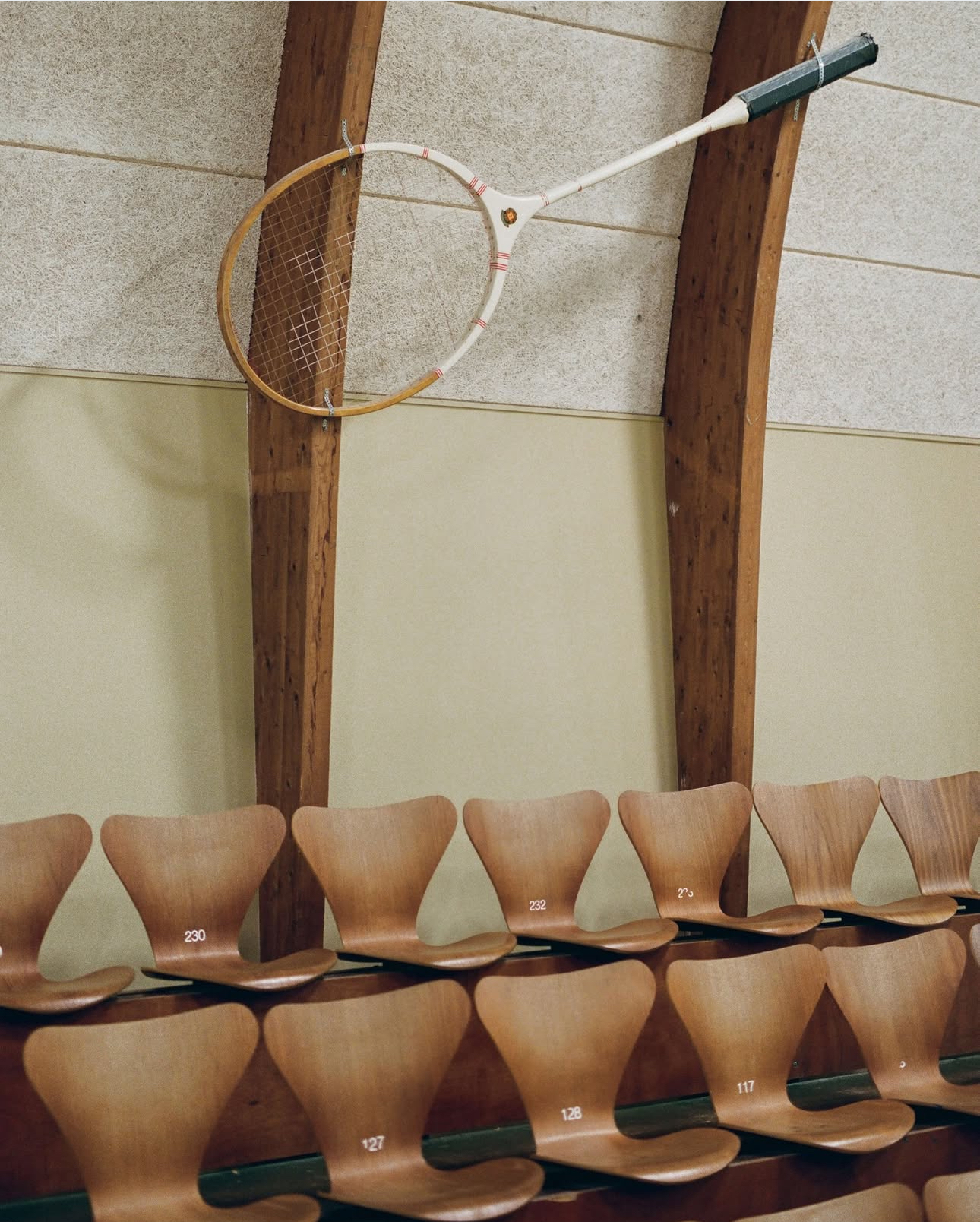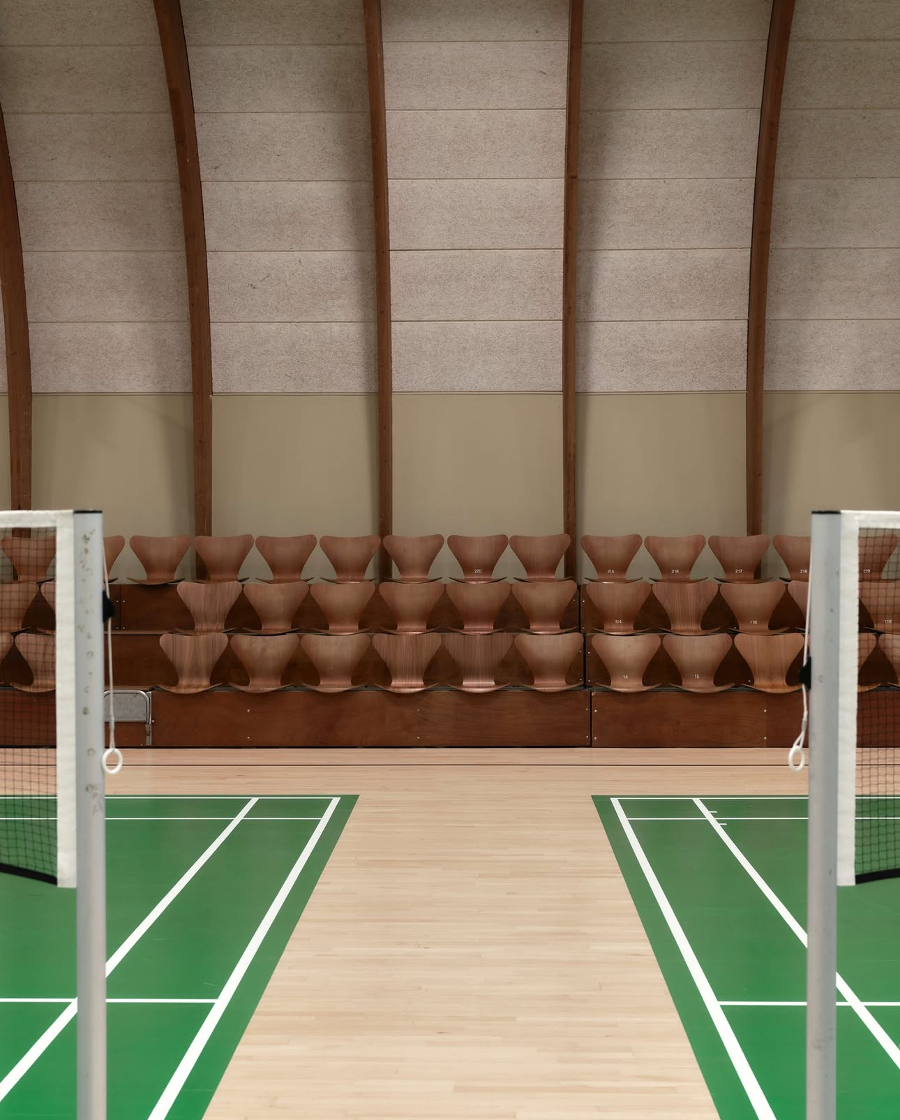 Till sist. Fritz Hansen satsar stort på sin Repair Service och i veckan visade de detta underbara exempel. I byn Lilleröd, inte långt från företagets huvudkontor, finns nämligen den finaste badmintonhall jag sett. Byggd 1973 med läktare där publiken sitter på (nyrenoverade) sjuanstolar!