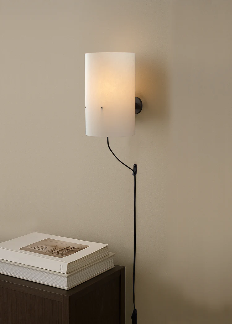 Zlamp har lanserat en ny vägglampa med en handgjord skärm i mullbärspapper som sprider ett mjukt, bländfritt sken och en liten detalj i läder som håller sladden på plats.