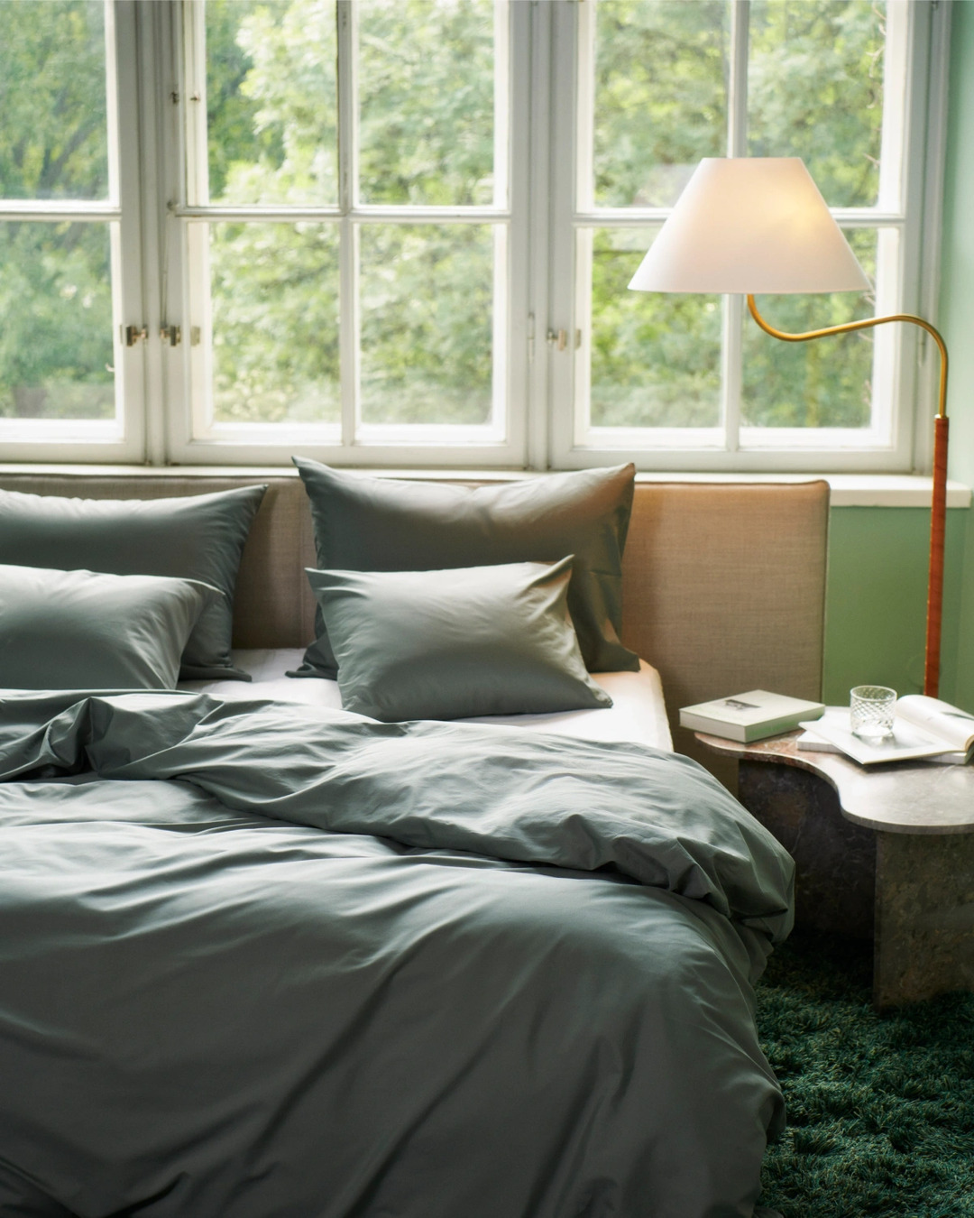 Svenska Ogland lanserar sina sängkläder i percale i tre nya kulörer: Agave Green, Deep Blue och Silt Greige.