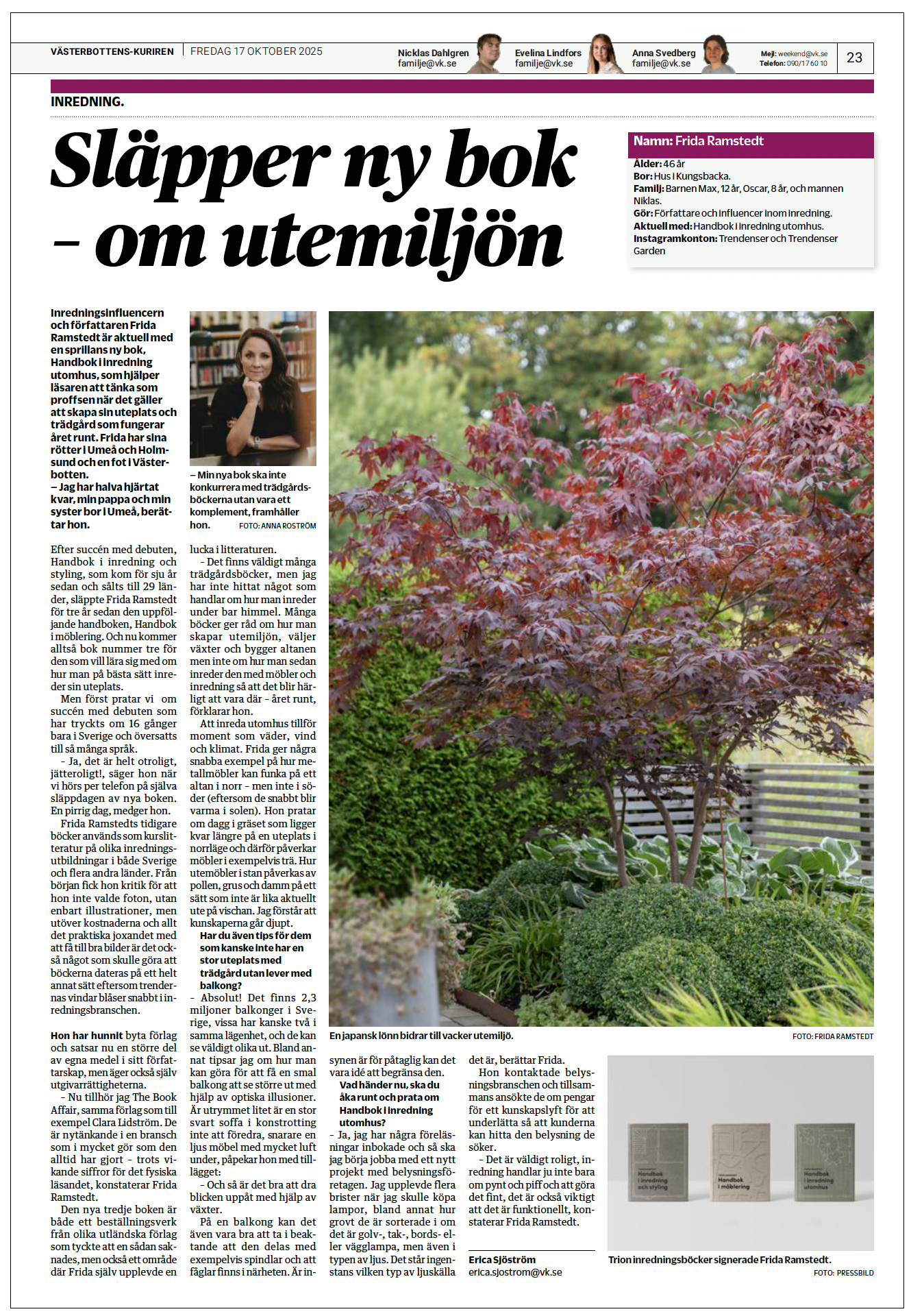 Jag fick precis en länk till Västerbottens kurirens weekendbilaga, som också finns att läsa på nätet. Jag är ju född och uppvuxen i Umeå och förra veckan intervjuades jag av deras lokaltidning om min nya Handbok i inredning utomhus, men också om vad jag ska jobba med framöver. Jag har nämligen fått ett nytt uppdrag; som projektledare för ett kunskapslyft initierat av den svenska belysningsbranschen! Här hittar du artikeln på webben.