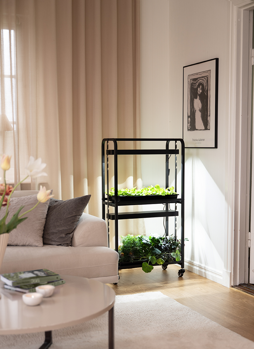 Impectas bilder är fotade i ett vardagsrum, men jag tänker att de här lysande vagnarna öppnar upp för att man nu också kan odla på helt nya ställen som i källaren, varmgaraget, förrådet, gästrummet osv För mig känns det här som den perfekta lösningen för att förenkla odlandet hemma – året runt.